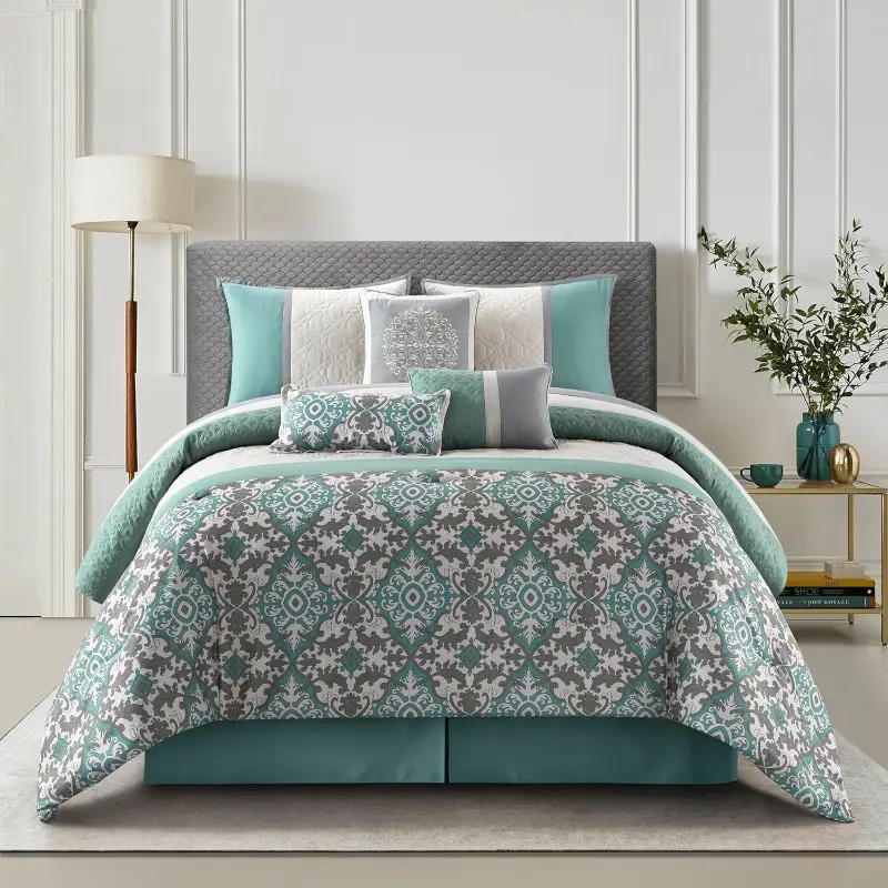 El juego incluye: 1 edredón, 1 falda de cama, 2 fundas de almohada, 3 almohadas decorativas.